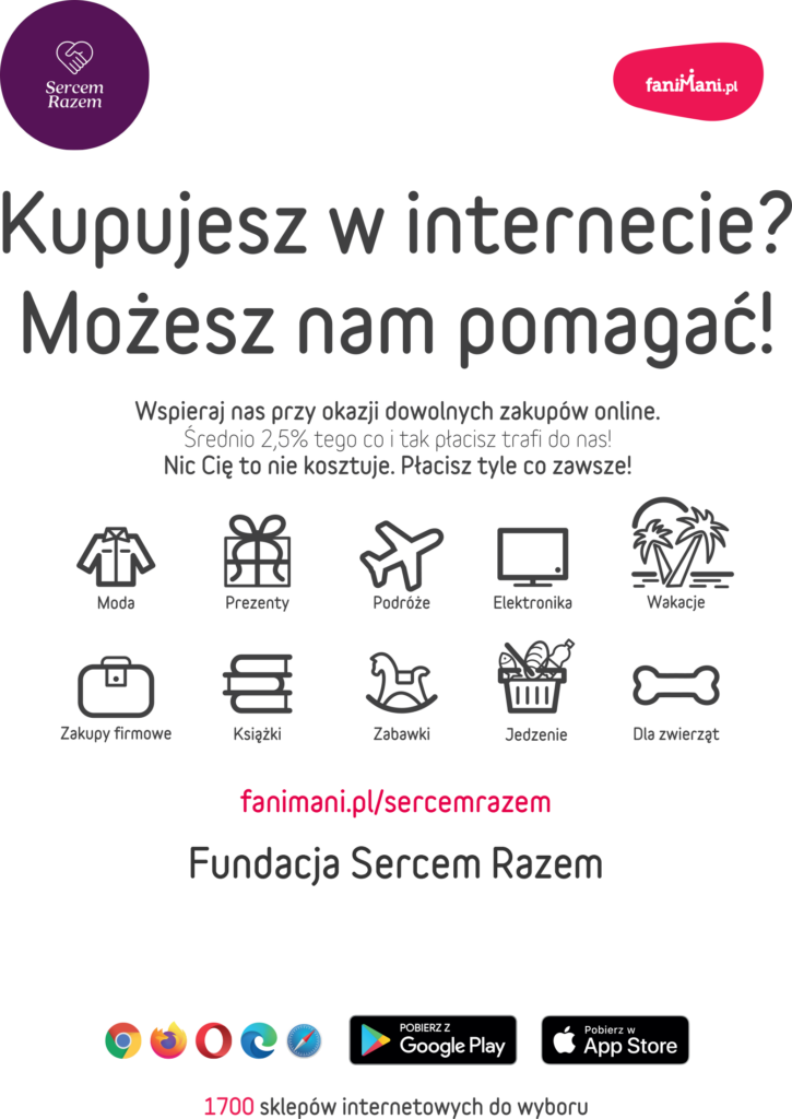 Dzięki FaniMani.pl możesz bezpłatnie pomagać przy okazji zakupów w internecie. Wystarczy, że przed zakupami Aktywujesz Darowiznę (1 kliknięcie!), a określony na stronie procent darowizny trafi do naszej Fundacji. W ten sposób każdy wygrywa – Ty masz produkt w tej samej cenie, a my darowiznę. Serwis jest bezpłatny.