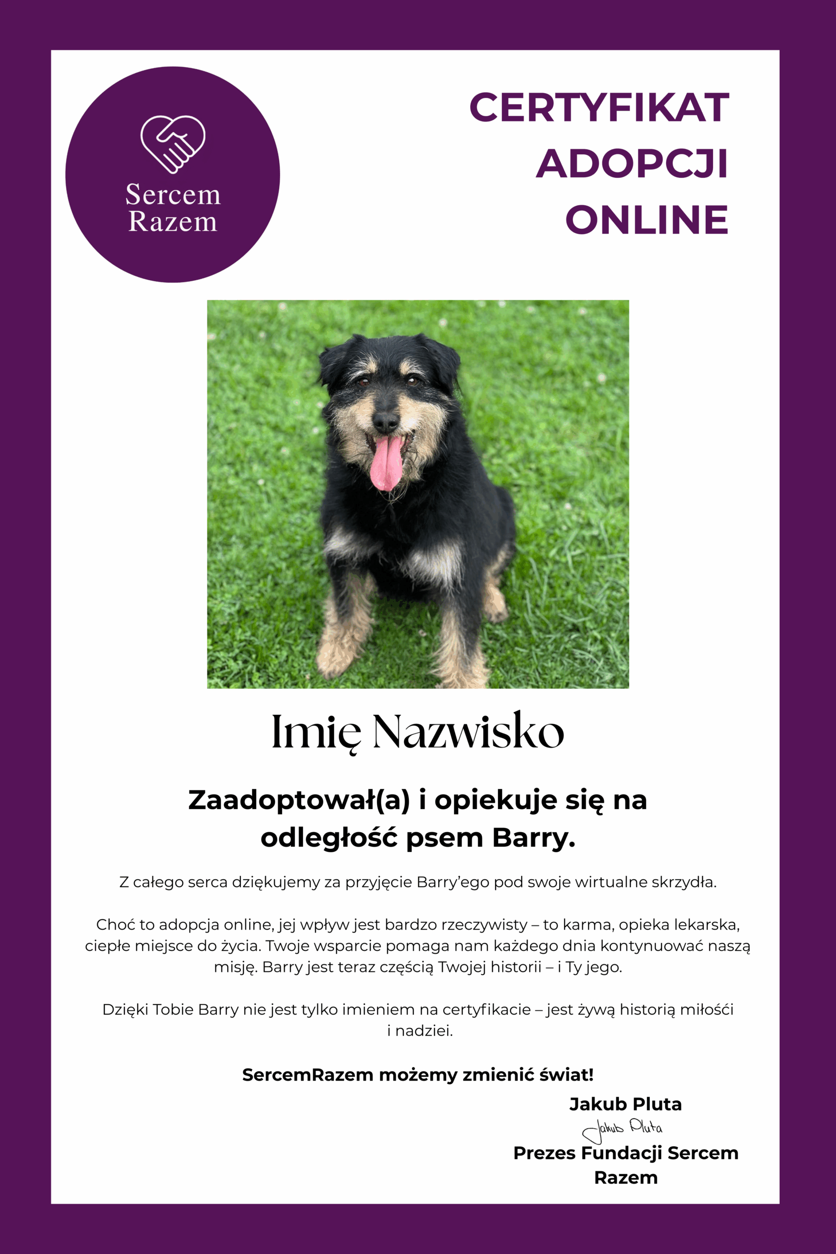 🏅 Adoptując Barry’ego, otrzymasz certyfikat, który wyślemy na Twój adres e-mail.