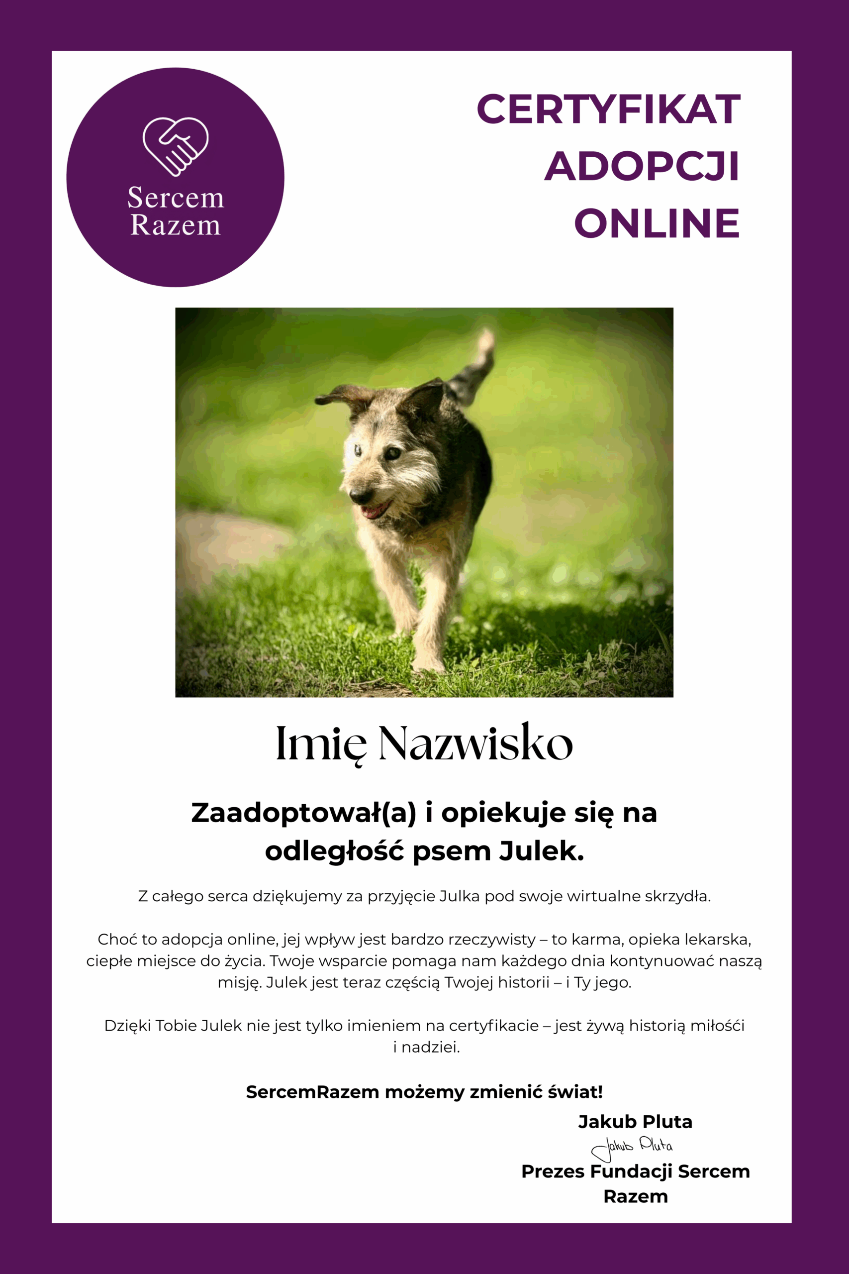 🏅 Adoptując Julka, otrzymasz certyfikat, który wyślemy na Twój adres e-mail.