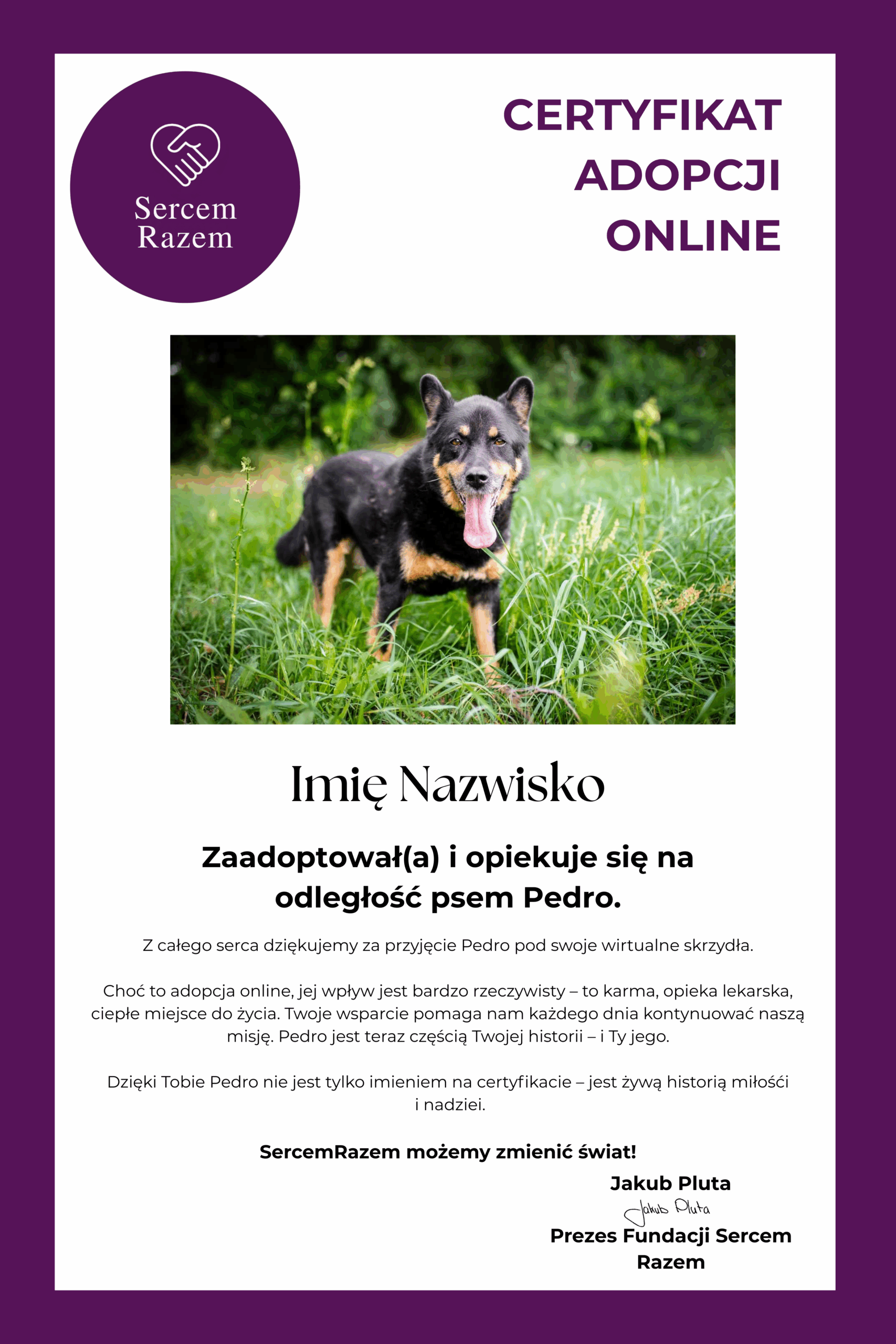 🏅 Adoptując Pedro, otrzymasz certyfikat, który wyślemy na Twój adres e-mail.